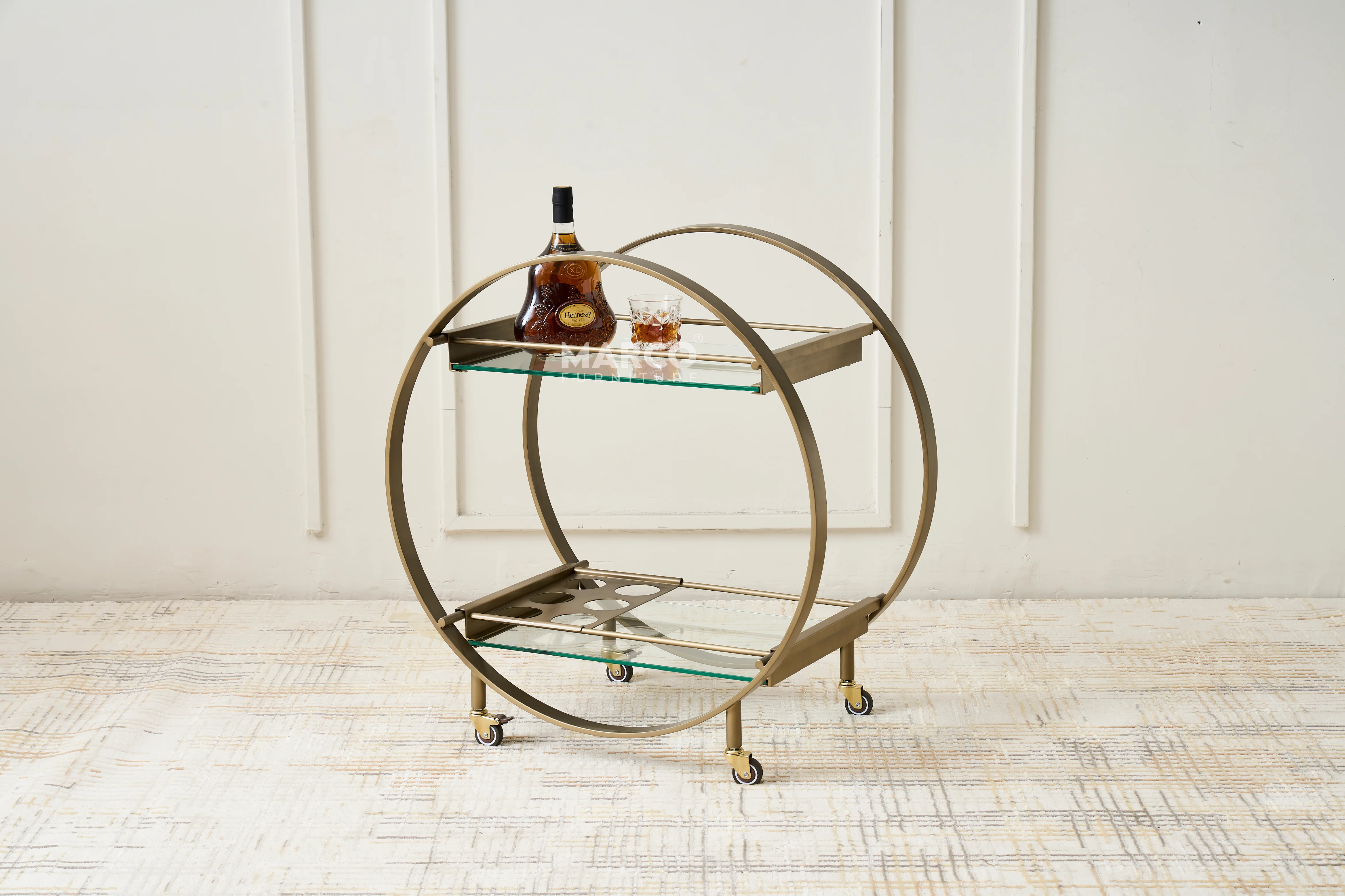The Artiss Drinks Trolley is a retro accent piece with a mobile support base. It features a circular structure, built from powder-coated iron with a gold finish. The bar trolley comes with two clear glass shelves and a bottle holder frame made of iron. This glamorous piece is perfect for serving drinks to your guests.