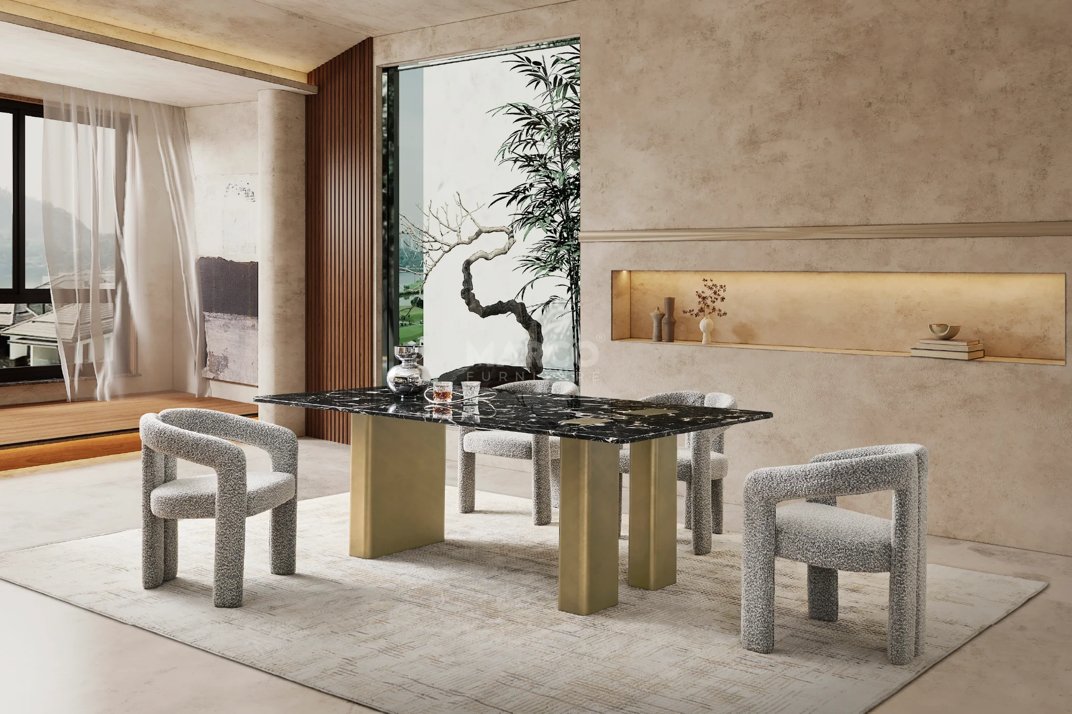 The Aurora Black Rose Marble Dining Table is a classic luxury furniture piece for modern dining rooms. Its black rose marble top features natural white veining and two gold rectangular inlays, exuding an artistic feel. Adding to its visual appeal, the table is supported by powder-coated metal legs in gold, offering a sturdy frame with a refined touch of luxury.