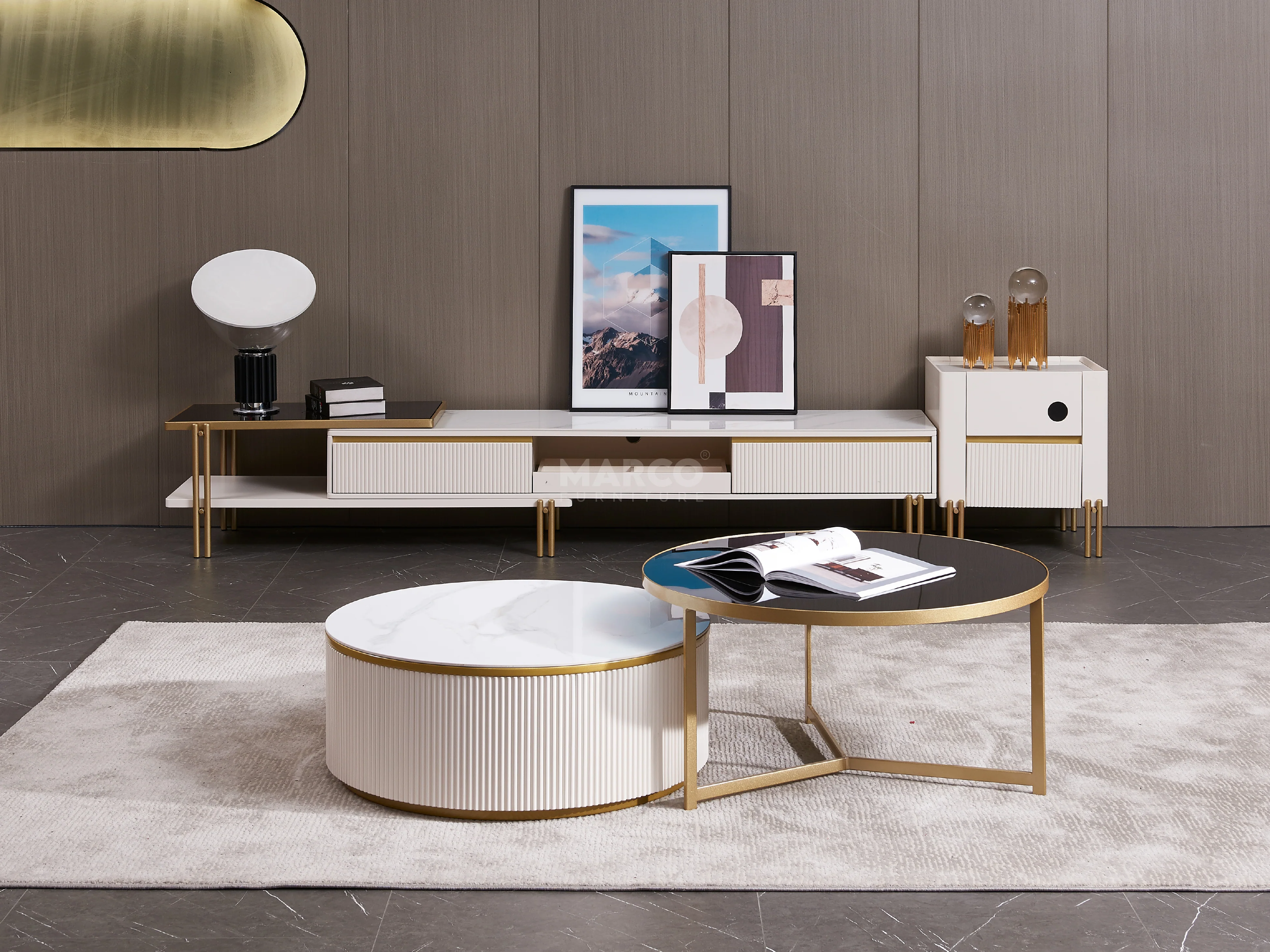 The Austin Extendable TV Stand is a practical and stylish addition to any living room. It features a smooth sintered stone top, a tempered glass extension, silent wooden drawers, and gold legs. This TV unit also comes with a matching side cabinet in white and gold, complementing its Nordic-inspired design.