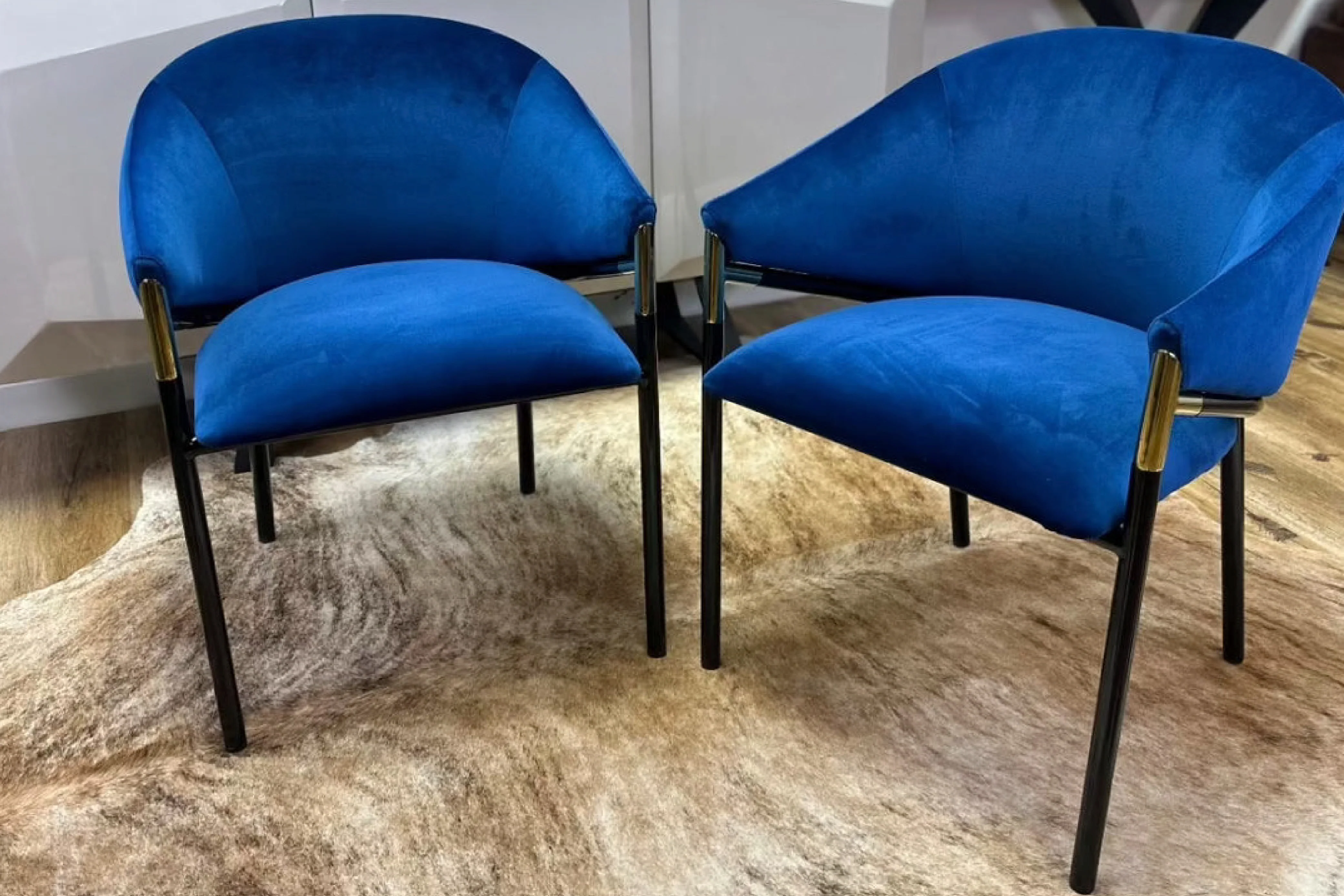 The Donnie dining chair is a Japandi-style chair featuring soft curves and a comfortable seat. This dining chair is crafted from luxurious velvet upholstery and durable metal legs. The colour contrast of blue and black makes this dining chair stand out in any interior style. Adding a hint of glam, the black metal legs are accented with champagne gold tips.