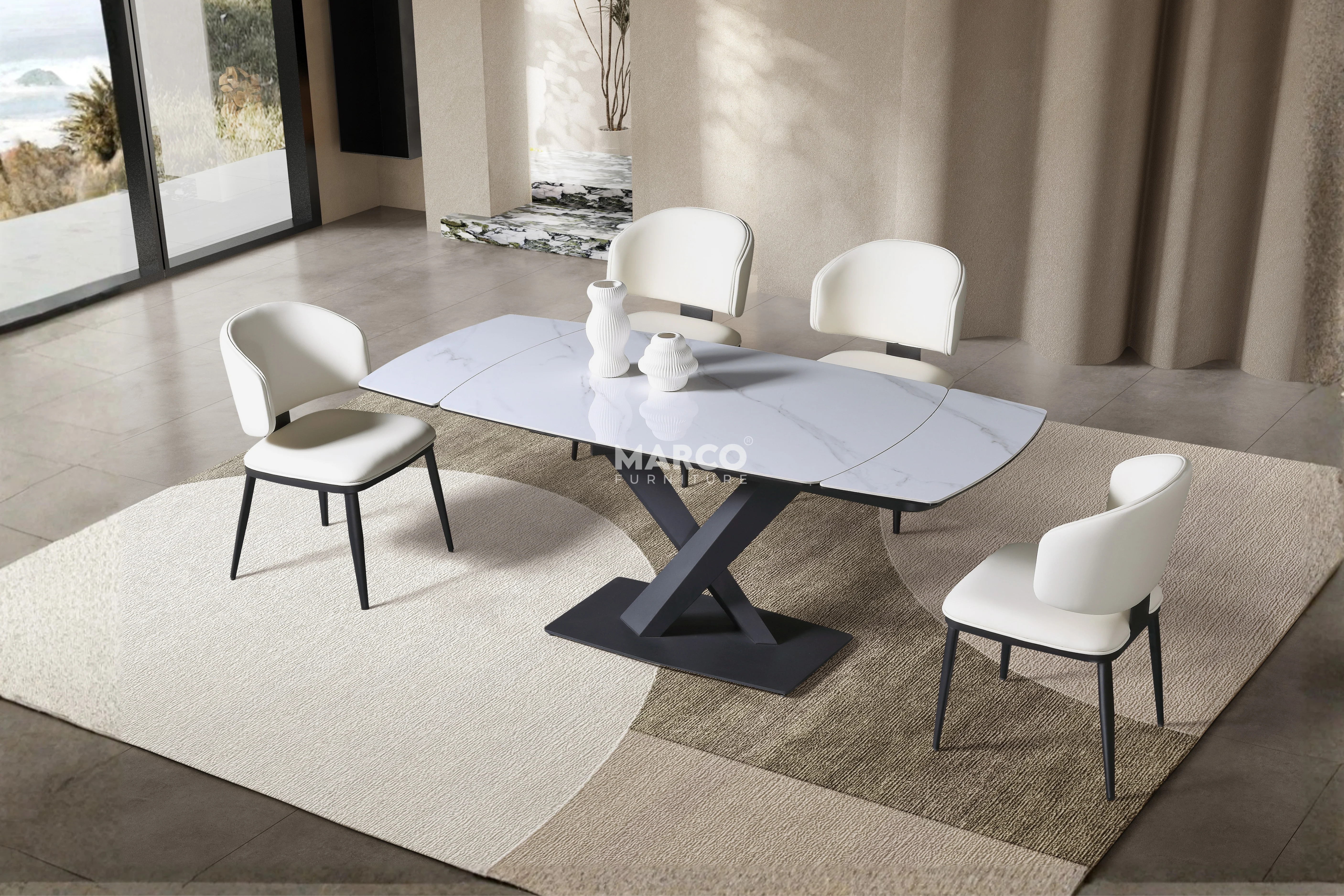 The Eclipse Extendable Sintered Stone Dining Table provides a modern dining experience. Its beautiful, clean-lined white sintered stone top features a stunning yet easy-to-maintain surface. The matte black powder-coated steel frame provides a bold and sturdy foundation to this table. Equipped with a swivel mechanism, the table effortlessly adjusts to suit your needs.