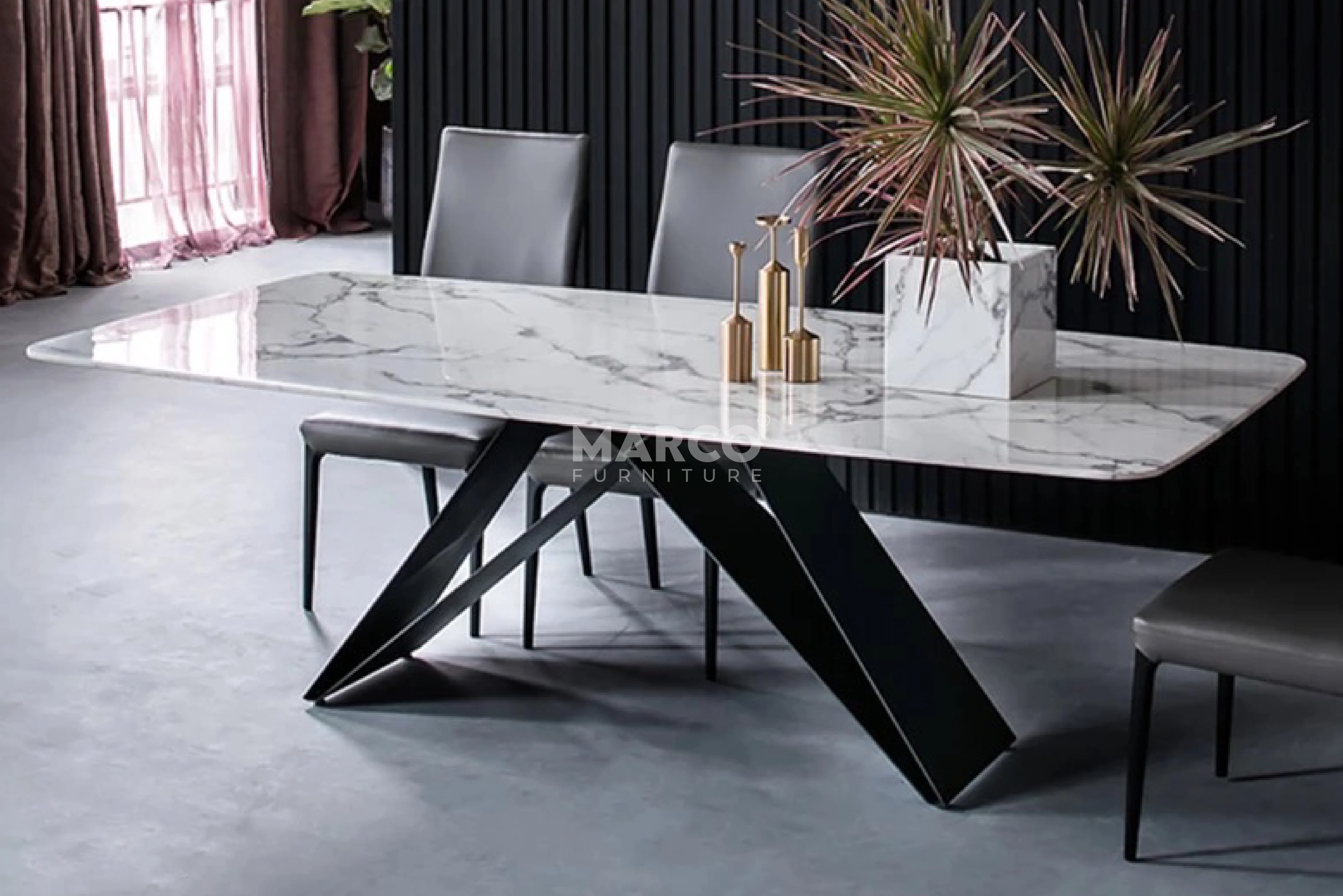 The Geneva Cattelan Style Dining Table comes in a beautiful cream-white ceramic top with natural brown veins. The gorgeous cut of ceramic serves as a spacious tabletop for everyday meals. The splayed designed base is made of metal, powder-coated in black for a matte finish. It’s perfectly suited for modern interiors and pairs beautifully with our comfortable dining chairs.