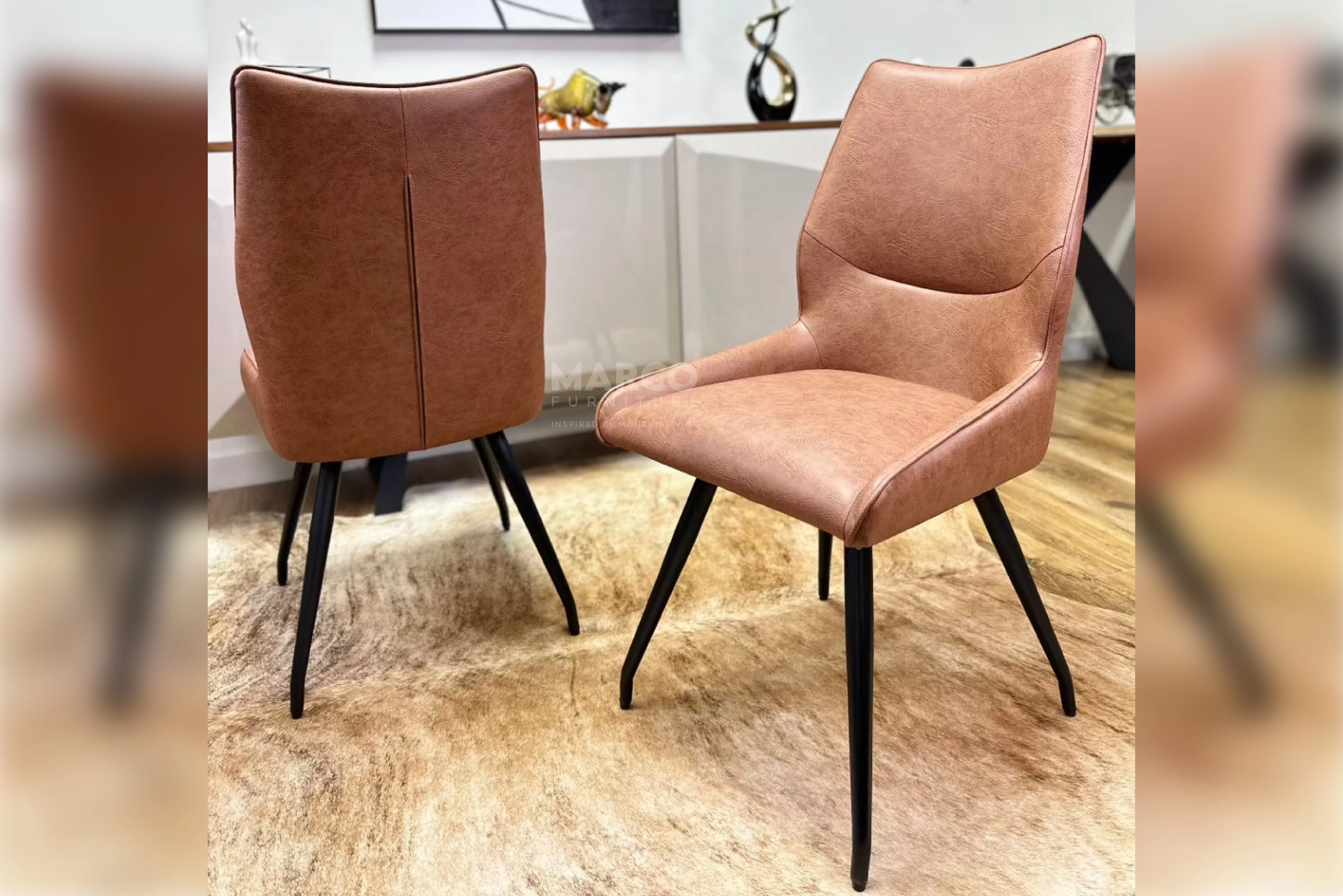 The Oz Tan Leather Dining Chair features a mid-century modern design with a curved structure. This high-back dining chair is upholstered in tan faux leather. The tan seat contrasts beautifully with black metal legs, making this modern dining chair a functional addition to contemporary dining rooms.