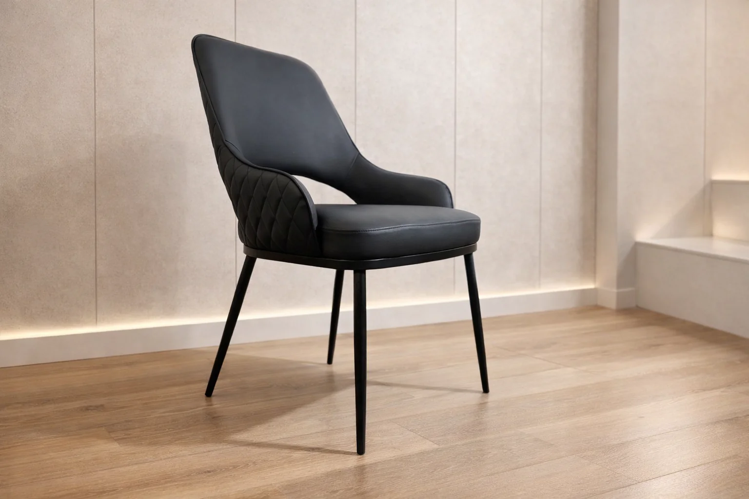 The 𝗣𝗿𝗮𝗱𝗮 𝗰𝘂𝗿𝘃𝗲𝗱-𝗯𝗮𝗰𝗸 𝗱𝗶𝗻𝗶𝗻𝗴 𝗰𝗵𝗮𝗶𝗿 features a Scandinavian design. This high-back dining chair is made from high-quality black leather with a rhombus pattern. The leather seat is supported with black metal legs, ensuring stability for daily use.